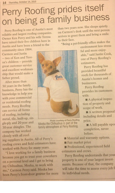 Meeka has spent her whole life making sure everything at Perry Roofing runs smoothly. She has traveled to the the offices and slept on many desks and eaten many treats while making sure operations are done correctly.
